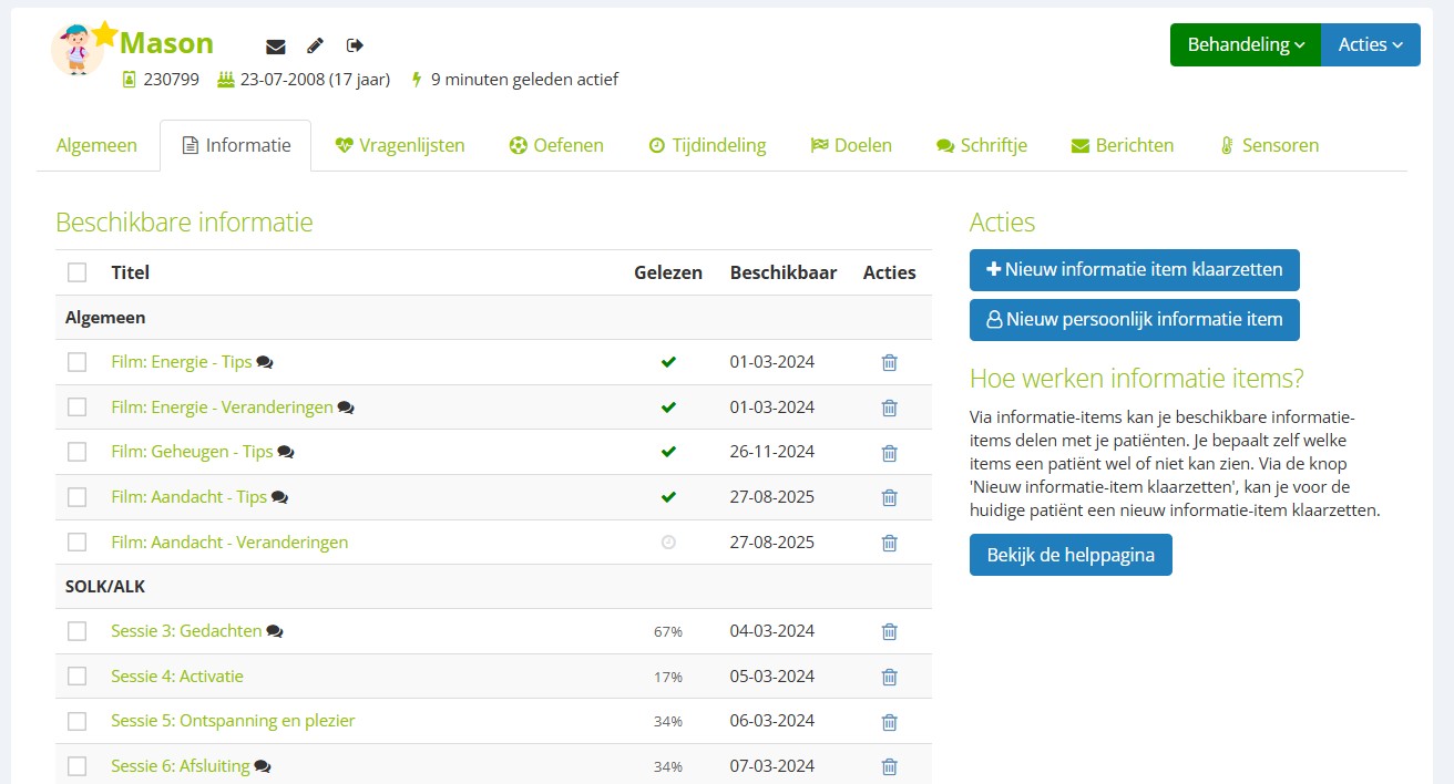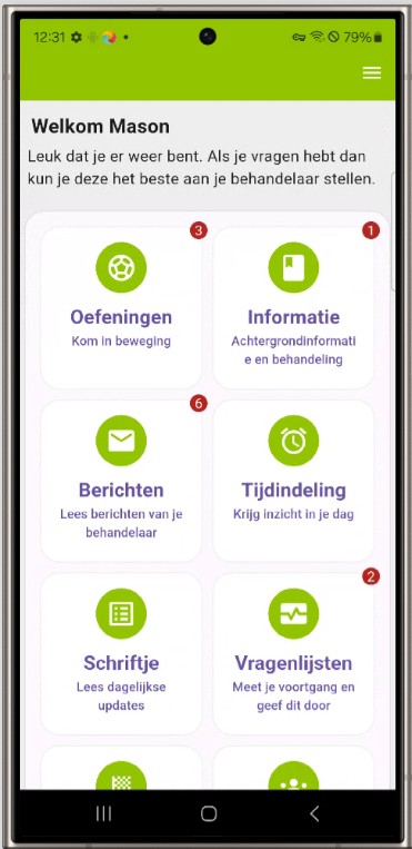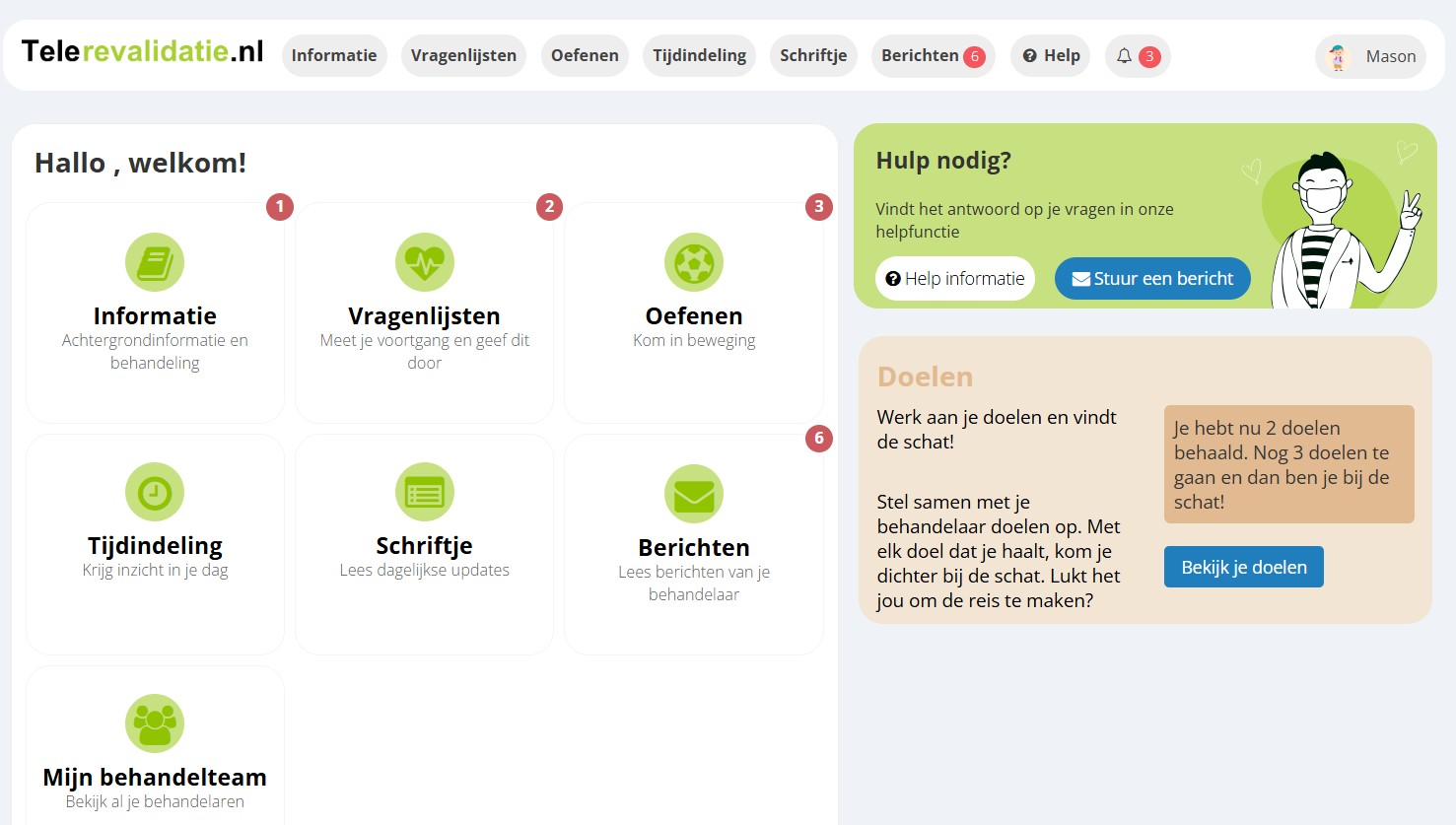 Door inhoud via Telerevalidatie klaar te zetten, ziet de patient welke oefeningen en informatie items er die dag klaar staan. Ook kan informatie op een later moment teruglezen worden of gedeeld worden met een naaste.